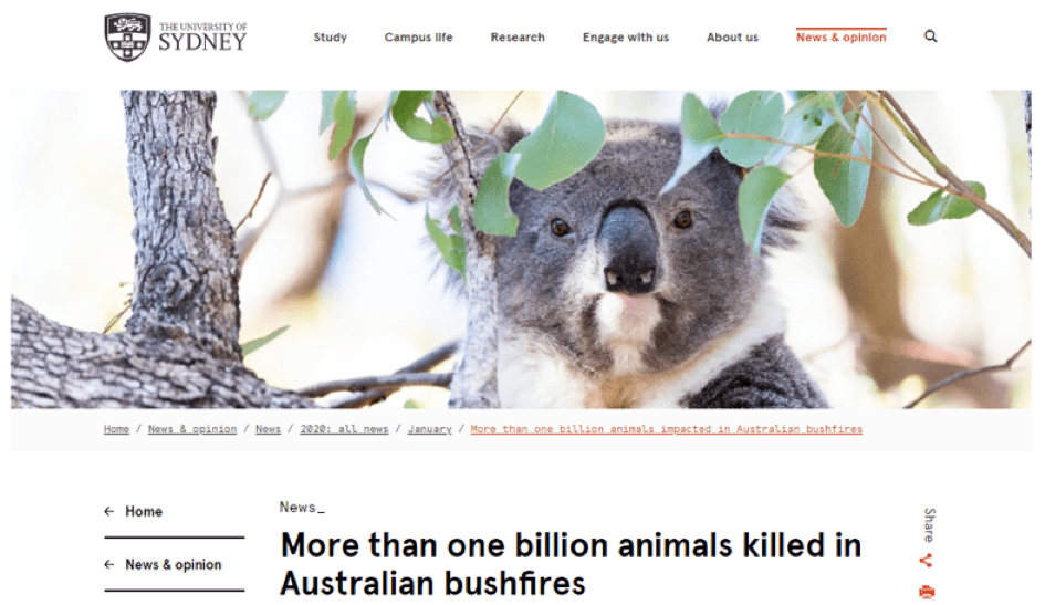 The University of Sidney. New&Opinion: More than one billion animals killed in Australian bushfires. Update on number of animals killed in Australian bushfires: Sydney expert (8 January 2020)