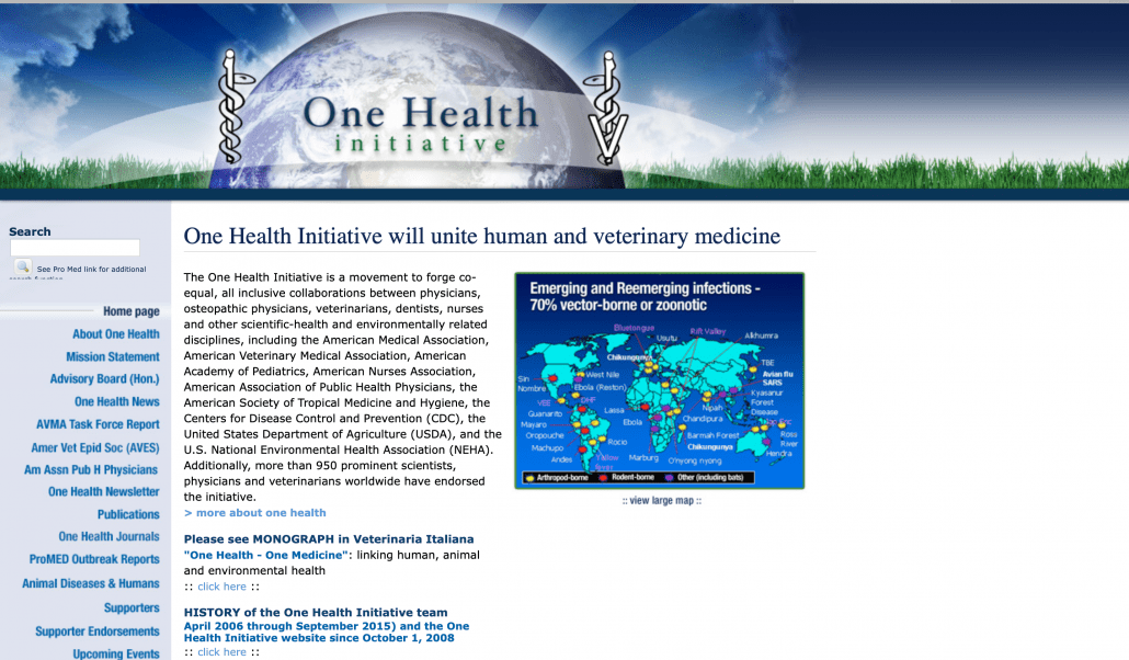 Una nueva llamada a la visión conjunta de la medicina tuvo lugar en 2004, con la celebración de la conferencia One world, One Healthorganizada por la Wildlife Conservation Society tras el surgimiento de nuevas enfermedades de transmisión animal en pleno siglo XXI. De la conferencia surgieron los 12 Principios de Manhattan, que piden considerar de una manera holística la relación entre las enfermedades zoonóticas y el medio ambiente. Y en 2008 se crea One Health Iniciative, un centro de intercambio de información en el que se publican noticias sobre el movimiento.